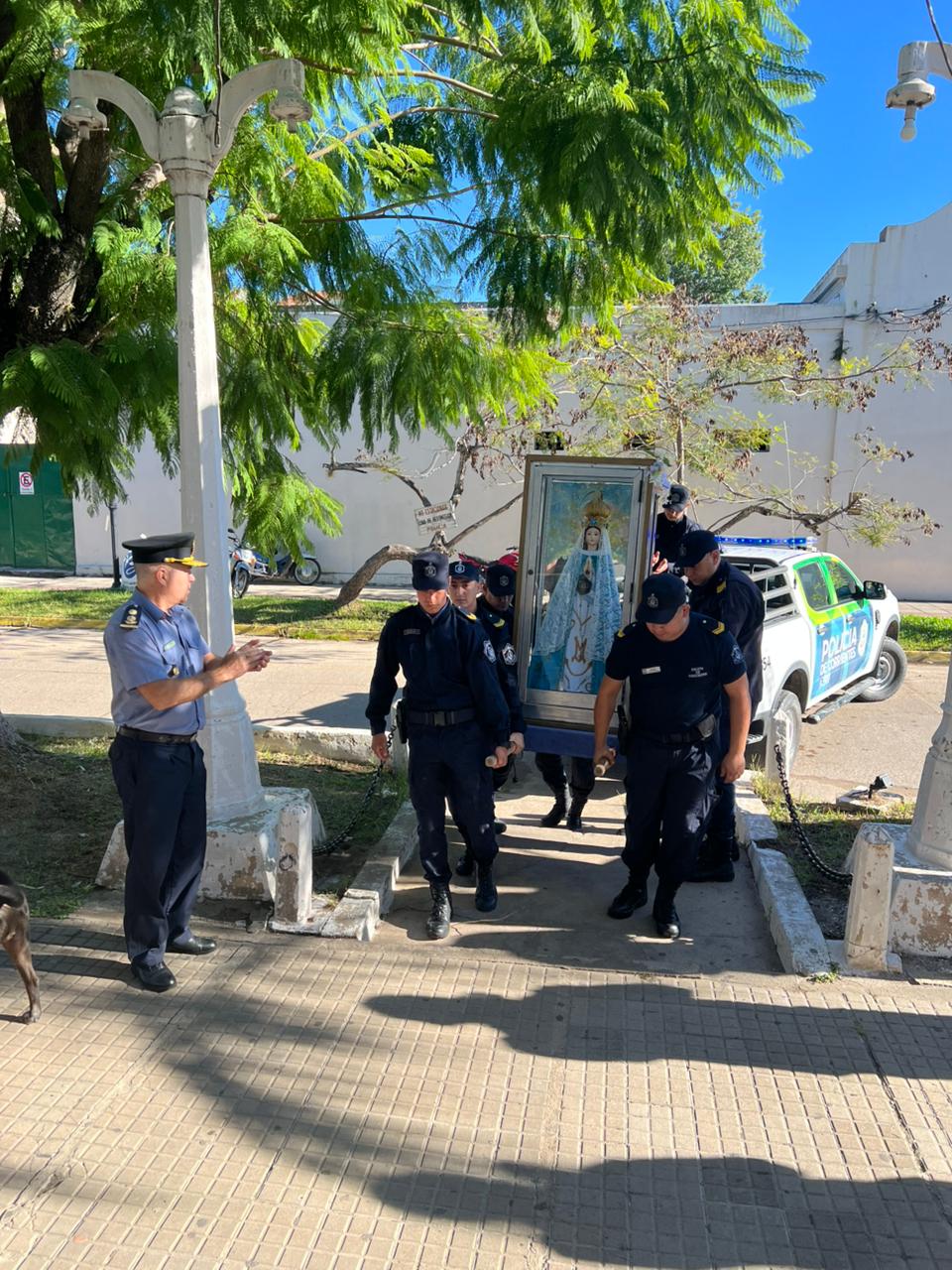 En el marco de su recorrido por distintas instituciones de la ciudad, la imagen de la Virgen llegó el domingo por la mañana a la Comisaría Primera, ubicada en calle Cnel. Schweizer casi Belgrano.