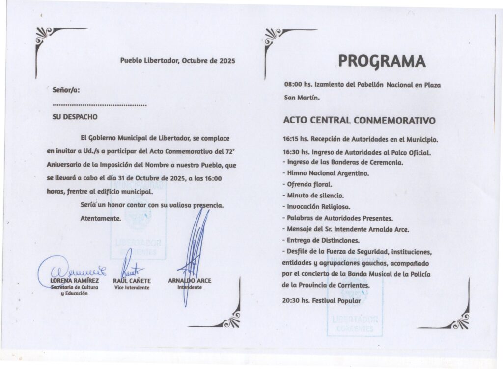 Como cada año, la comunidad de Pueblo Libertador se prepara para conmemorar el “Día de la Imposición del Nombre”, una fecha emblemática que recuerda el momento en que, en 1953, la localidad recibió oficialmente su denominación actual.