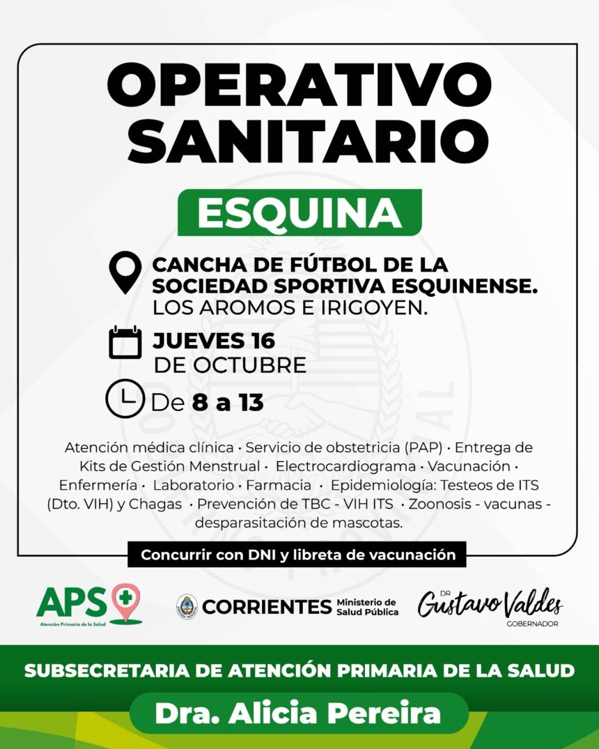 El jueves 15 de octubre se llevará a cabo un Operativo Sanitario en la ciudad de Esquina, organizado por el Ministerio de Salud Pública de Corrientes, a través de la Subsecretaría de Atención Primaria de la Salud.