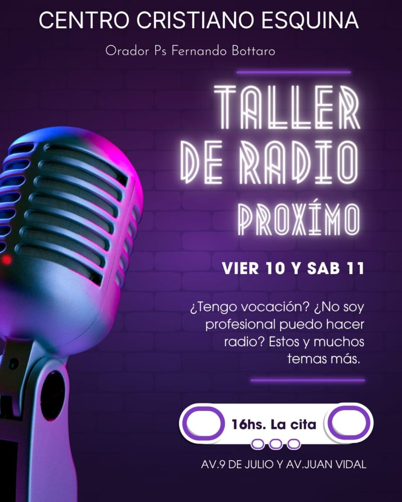 El Pastor Abel Almeida anunció la realización de un taller gratuito de medios de comunicación, que será dictado por el reconocido productor y comunicador Fernando Bottaro los días viernes 10 y sábado 11 de noviembre, de 16 a 18 horas, en el Centro Cristiano Esquina, ubicado en Avenida Juan Ramón Vidal, frente a la plazoleta Malvinas Argentinas.