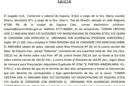 EDICTO El Juzgado Civil, Comercial y Laboral de Esquina (Corrientes), a cargo de la Dra.…