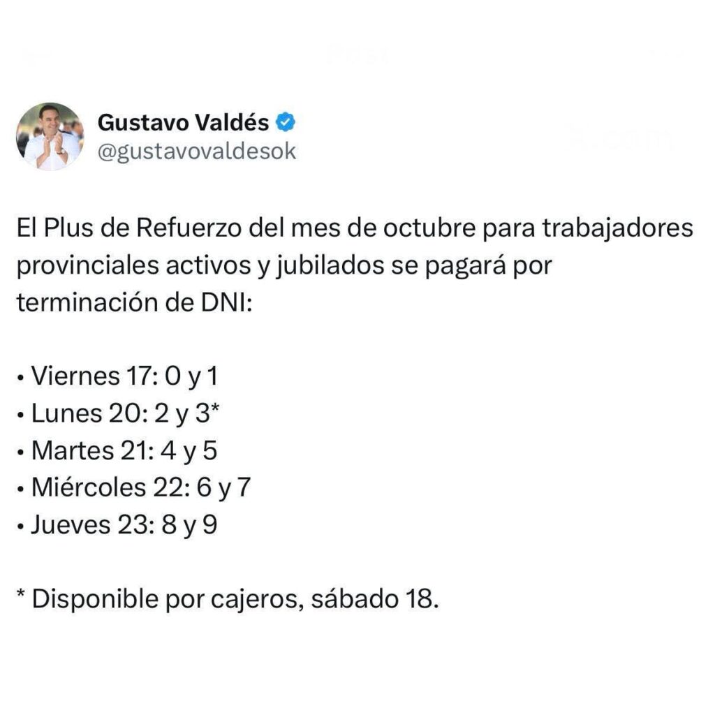 A través de sus redes sociales, @gustavovaldesok, comunicó el pago a los agentes de la administración pública provincial, activos, jubilados y pensionados del Plus de Refuerzo correspondiente a este mes de octubre, de $100 mil por beneficiarios.