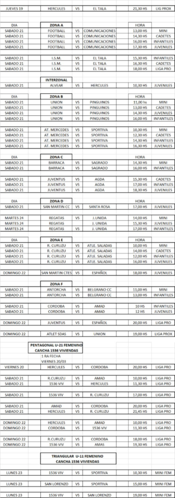 Uno de los focos estará puesto en los equipos de Esquina. Por la zona A, Foot Ball será local el sábado frente a Comunicaciones, en una jornada que incluirá cuatro categorías. En tanto, por la zona B, Sportiva viajará para medirse ante Atlético Mercedes, también en una serie de cuatro encuentros.