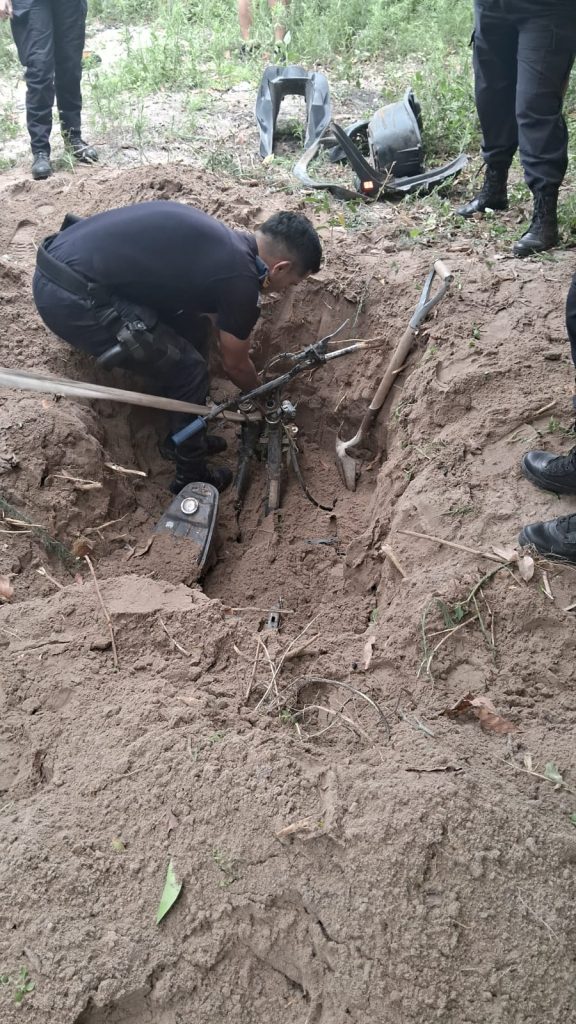 El procedimiento se llevó a cabo en una vivienda ubicada sobre avenida Juan Ramón Vidal, entre José Hernández y Río Corriente, arrojando resultado positivo. En el lugar se halló la motocicleta denunciada como sustraída, además de otras partes de motos, algunas de las cuales estaban enterradas en el fondo del domicilio.