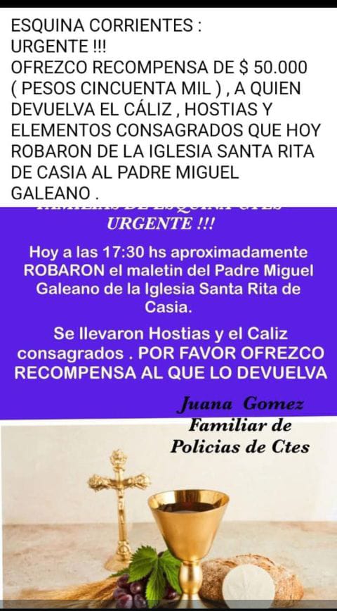 La Policía de Corrientes logró esclarecer el hecho de hurto denunciado el pasado miércoles por la tarde en la Parroquia Santa Rita de Casia de la ciudad de Esquina, donde habían sustraído elementos litúrgicos pertenecientes al padre Miguel Galeano.