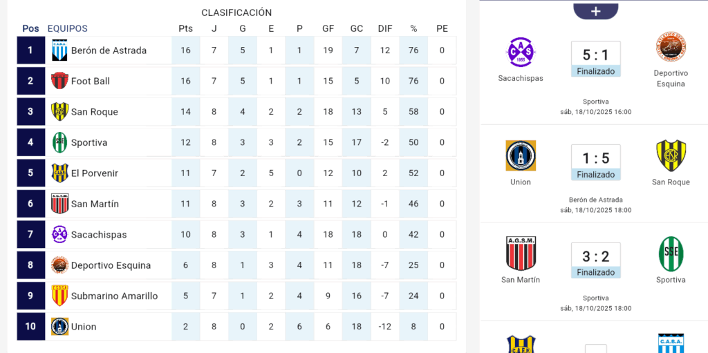 En una jornada disputada en la cancha de Sportiva, Sacachispas abrió la octava fecha con una goleada ante Deportivo Esquina. En el segundo turno, San Martín protagonizó una remontada épica y se quedó con un triunfo agónico por 3 a 2 frente a Sportiva. San Roque derrotó a Unión en Libertador 5 a 1