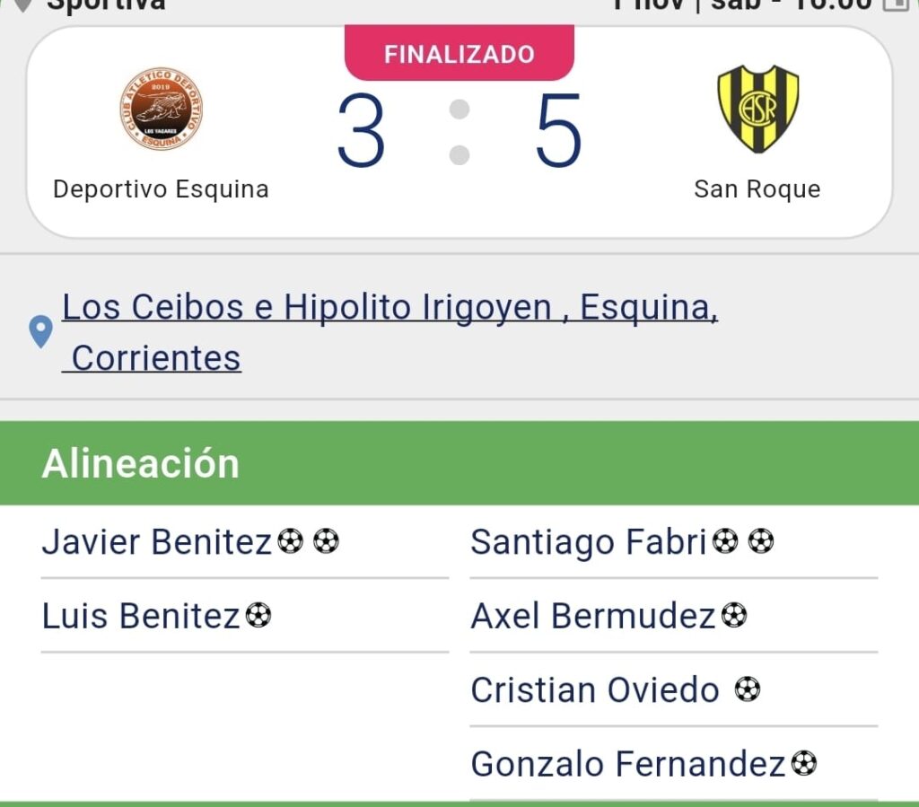 San Roque logró una victoria clave sobre Deportivo Esquina por 5 a 3 este sábado en cancha de Sportiva, ubicada en Los Ceibos e Hipólito Irigoyen, en el marco del torneo local y aseguró el tercer puesto.