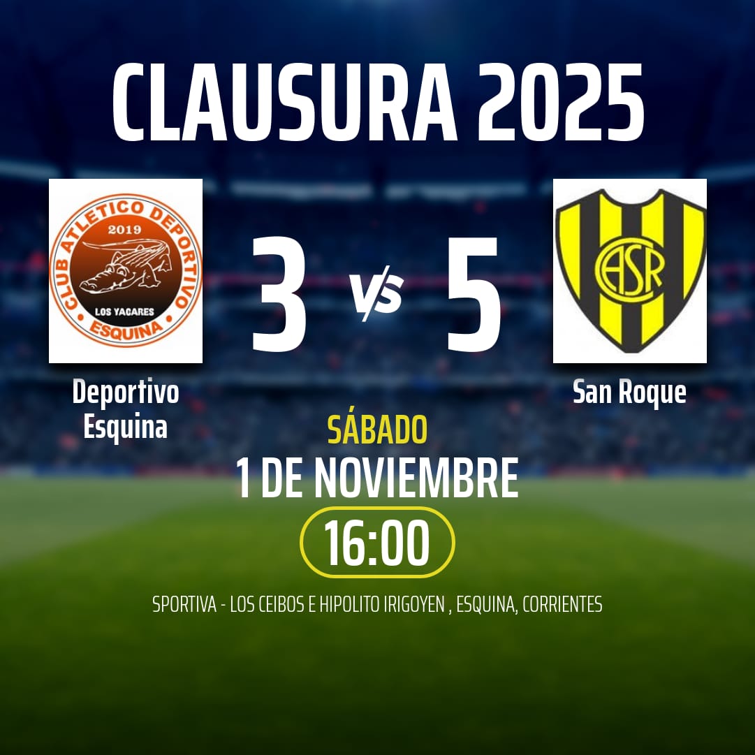 San Roque logró una victoria clave sobre Deportivo Esquina por 5 a 3 este sábado en cancha de Sportiva, ubicada en Los Ceibos e Hipólito Irigoyen, en el marco del torneo local y aseguró el tercer puesto.