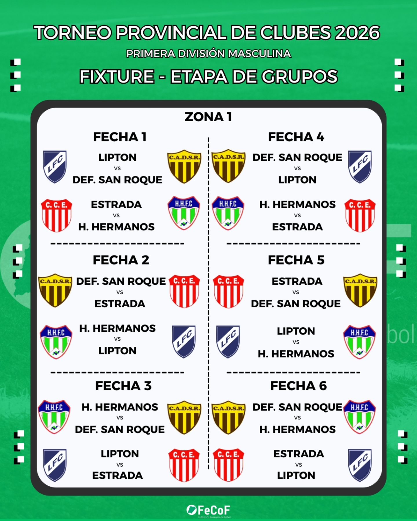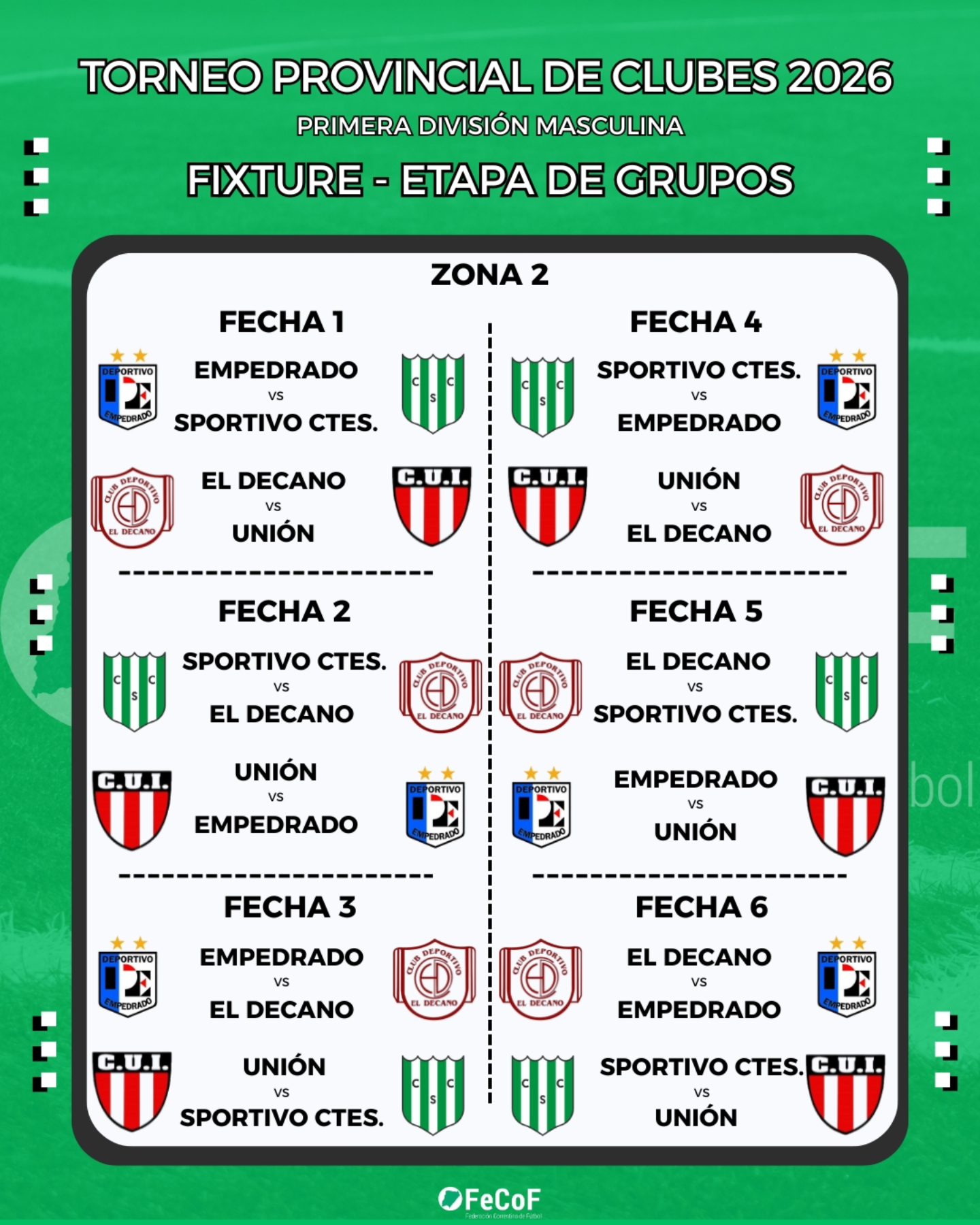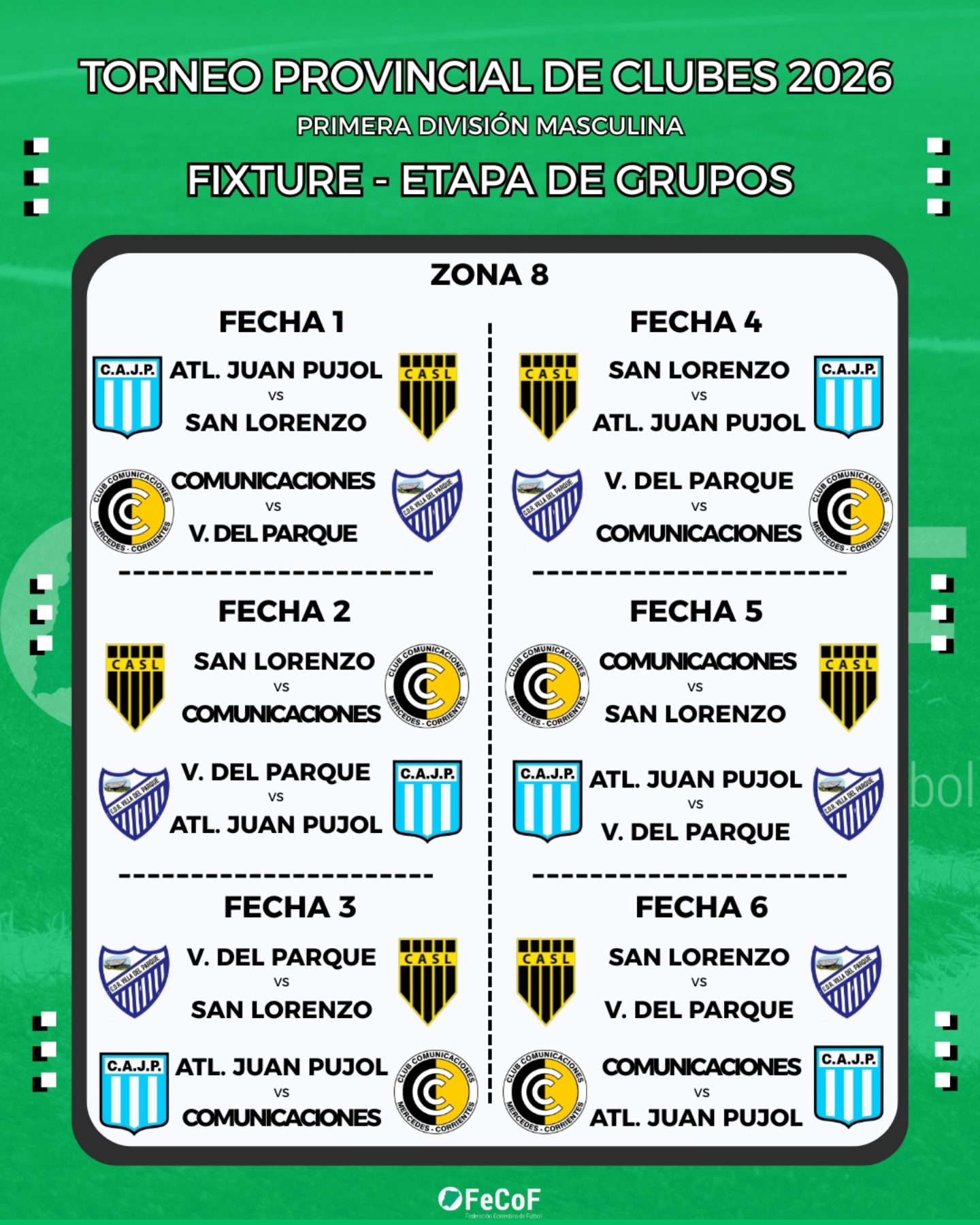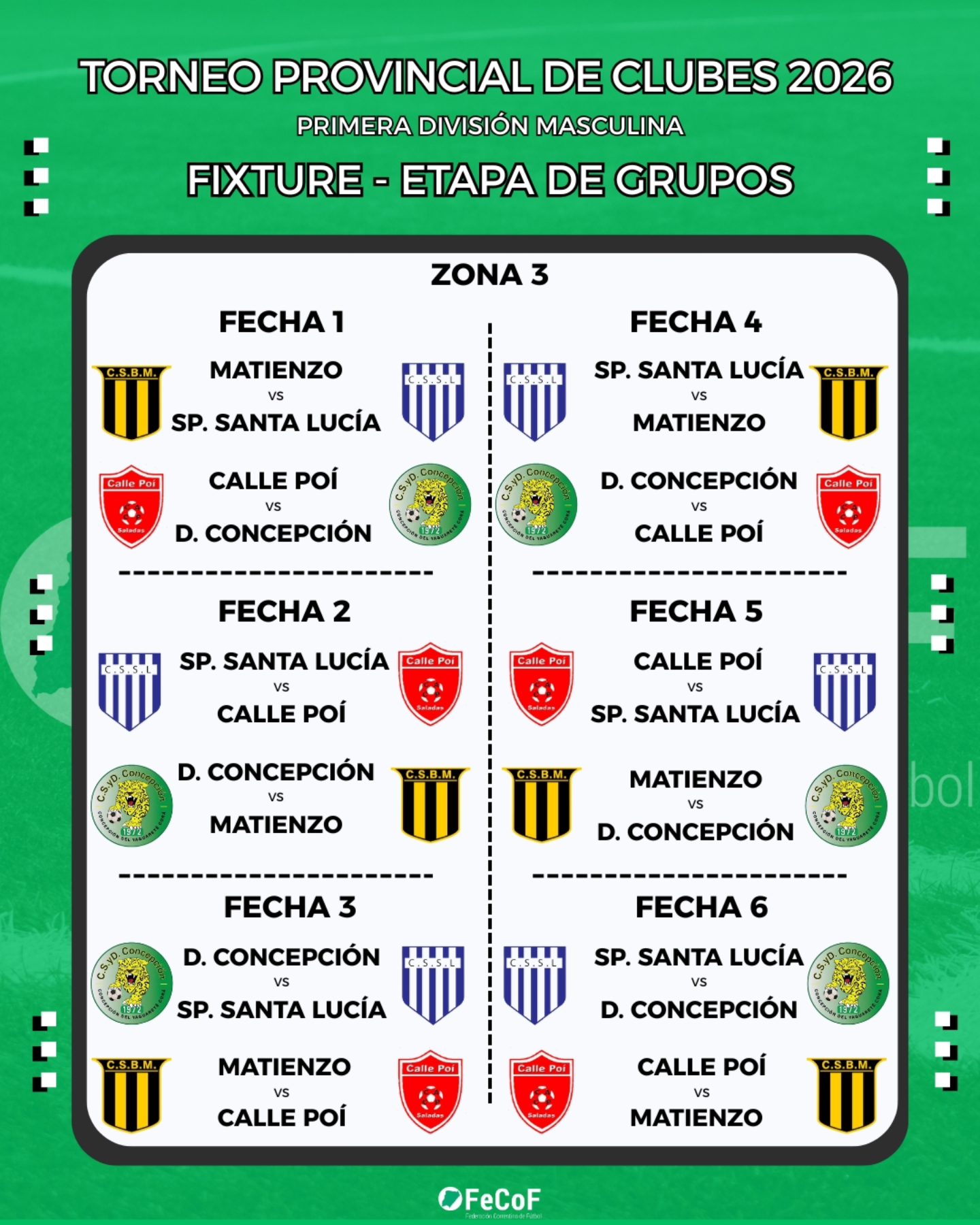 La Federación Correntina de Fútbol (FeCoF) dio a conocer la programación oficial de partidos del Torneo Provincial de Clubes 2026 – Primera División Masculina, certamen que reunirá a 32 equipos de distintos puntos de la provincia y que comenzará el fin de semana del 1 de marzo con la disputa de la etapa de grupos.