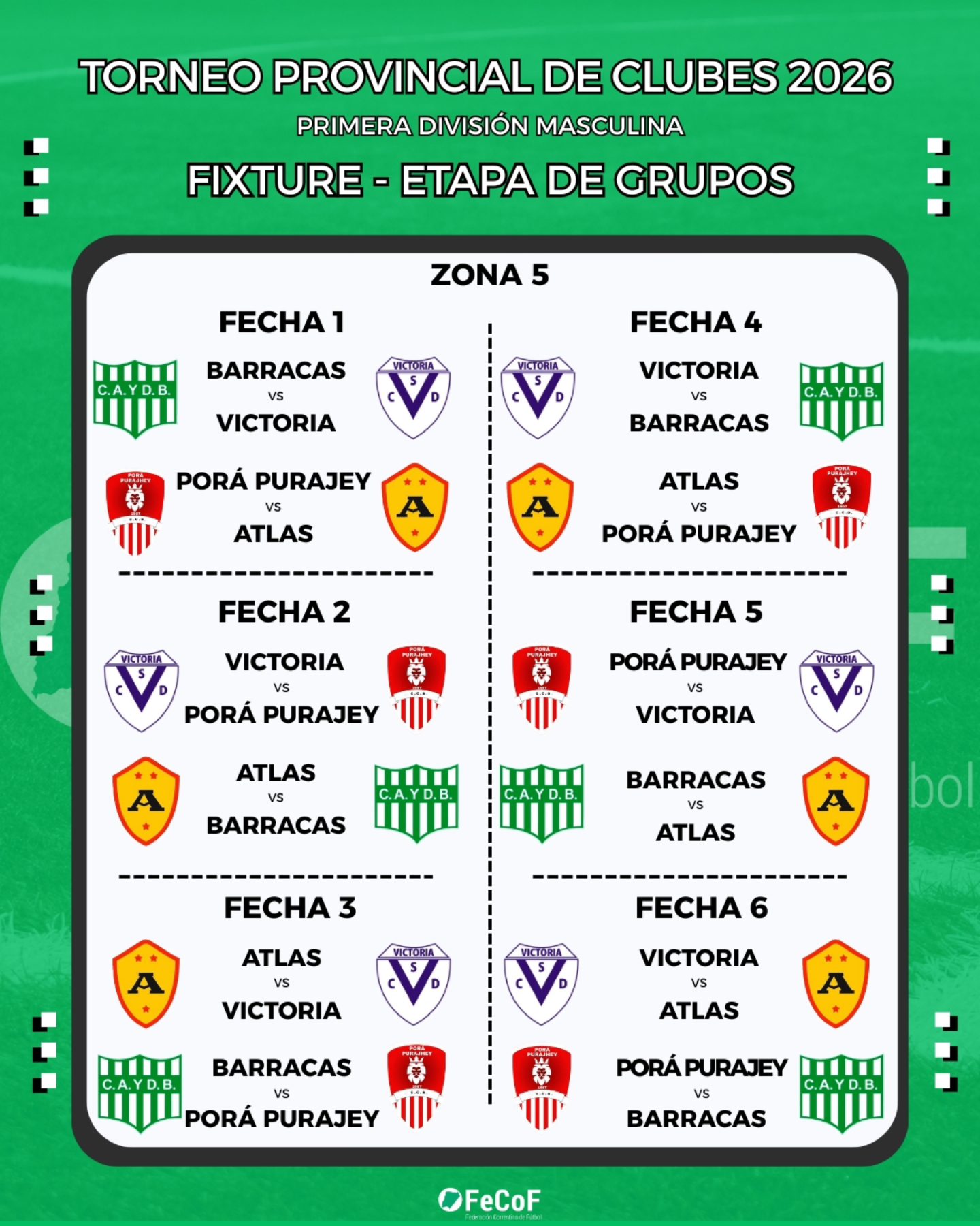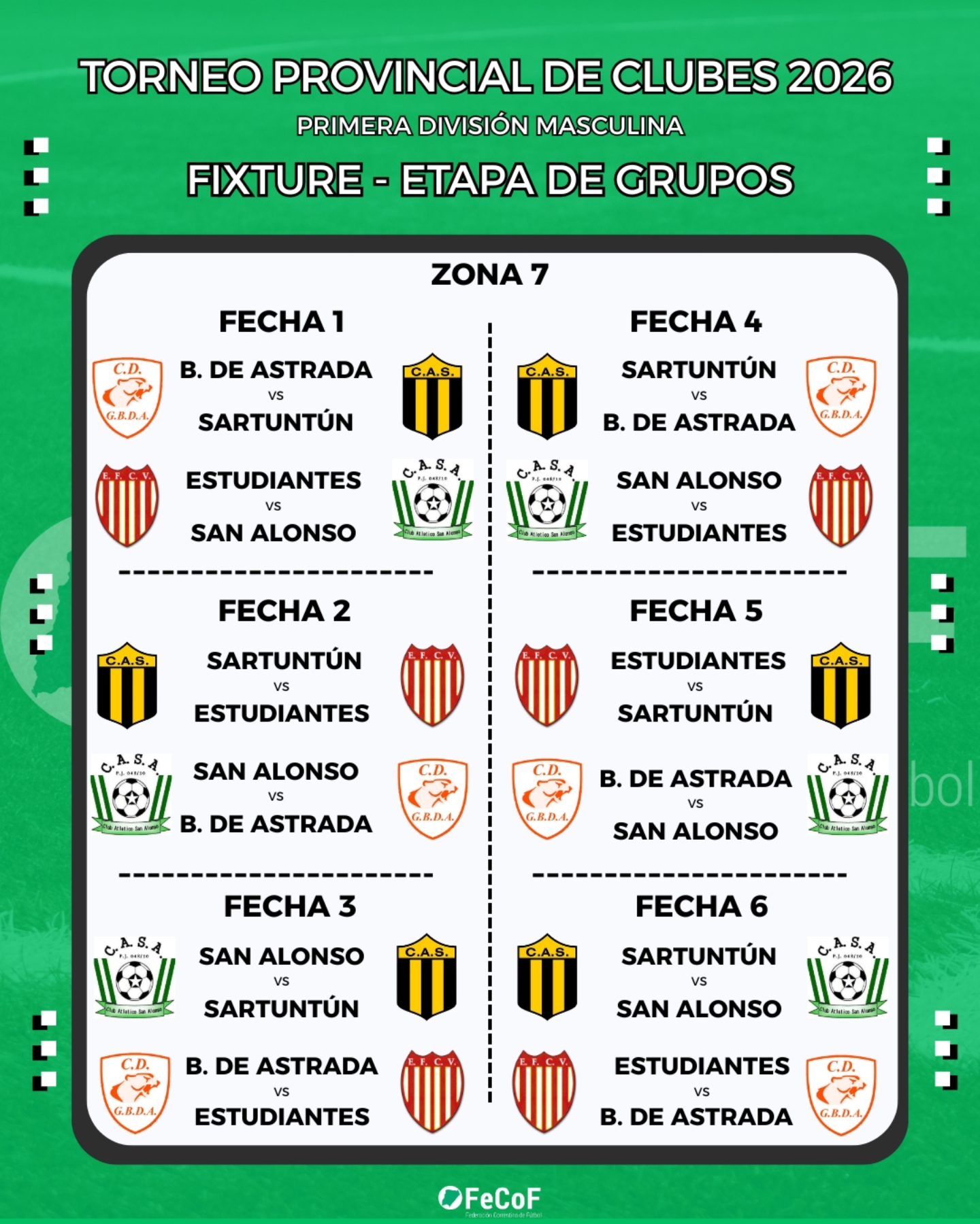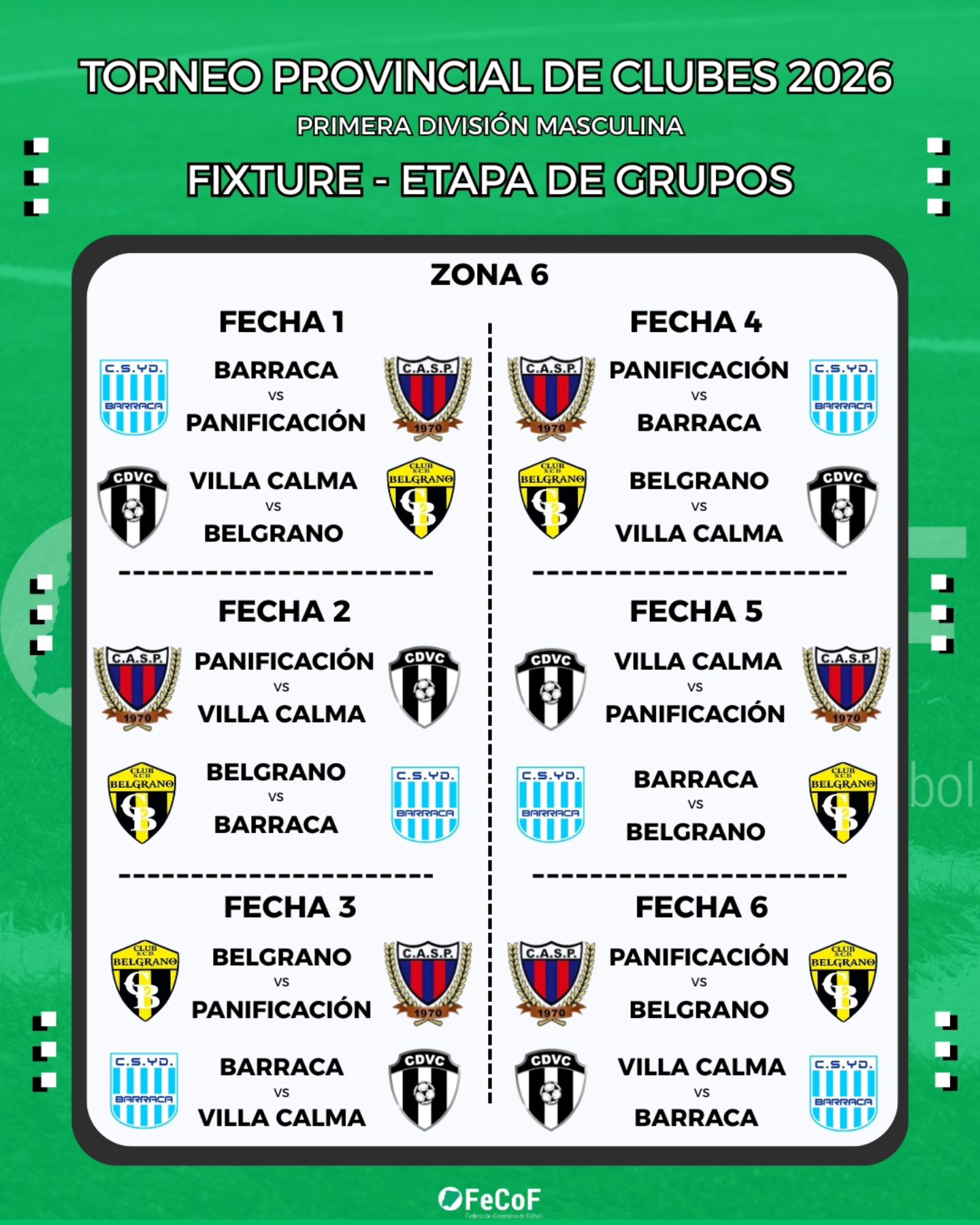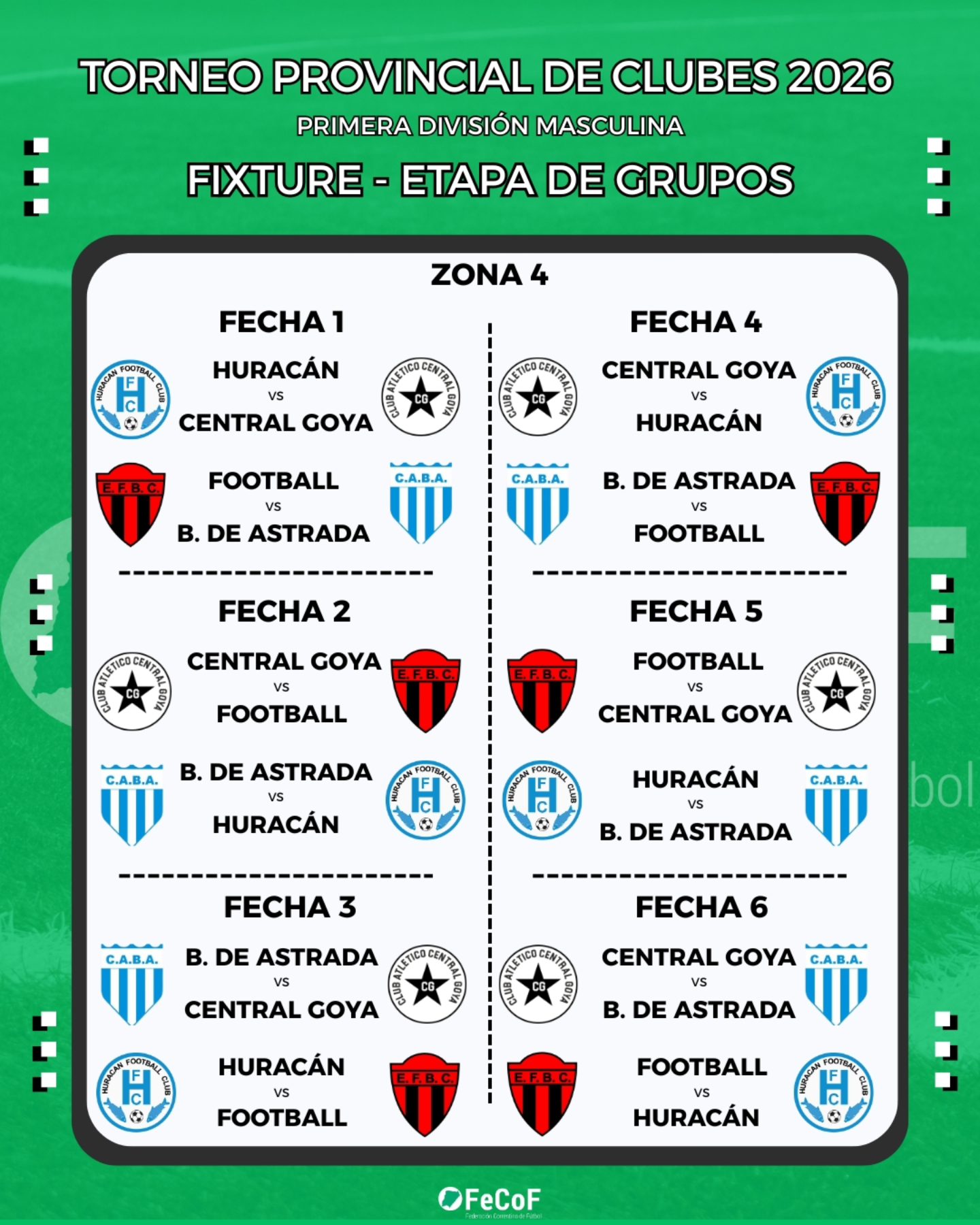 La Federación Correntina de Fútbol (FeCoF) dio a conocer la programación oficial de partidos del Torneo Provincial de Clubes 2026 – Primera División Masculina, certamen que reunirá a 32 equipos de distintos puntos de la provincia y que comenzará el fin de semana del 1 de marzo con la disputa de la etapa de grupos.