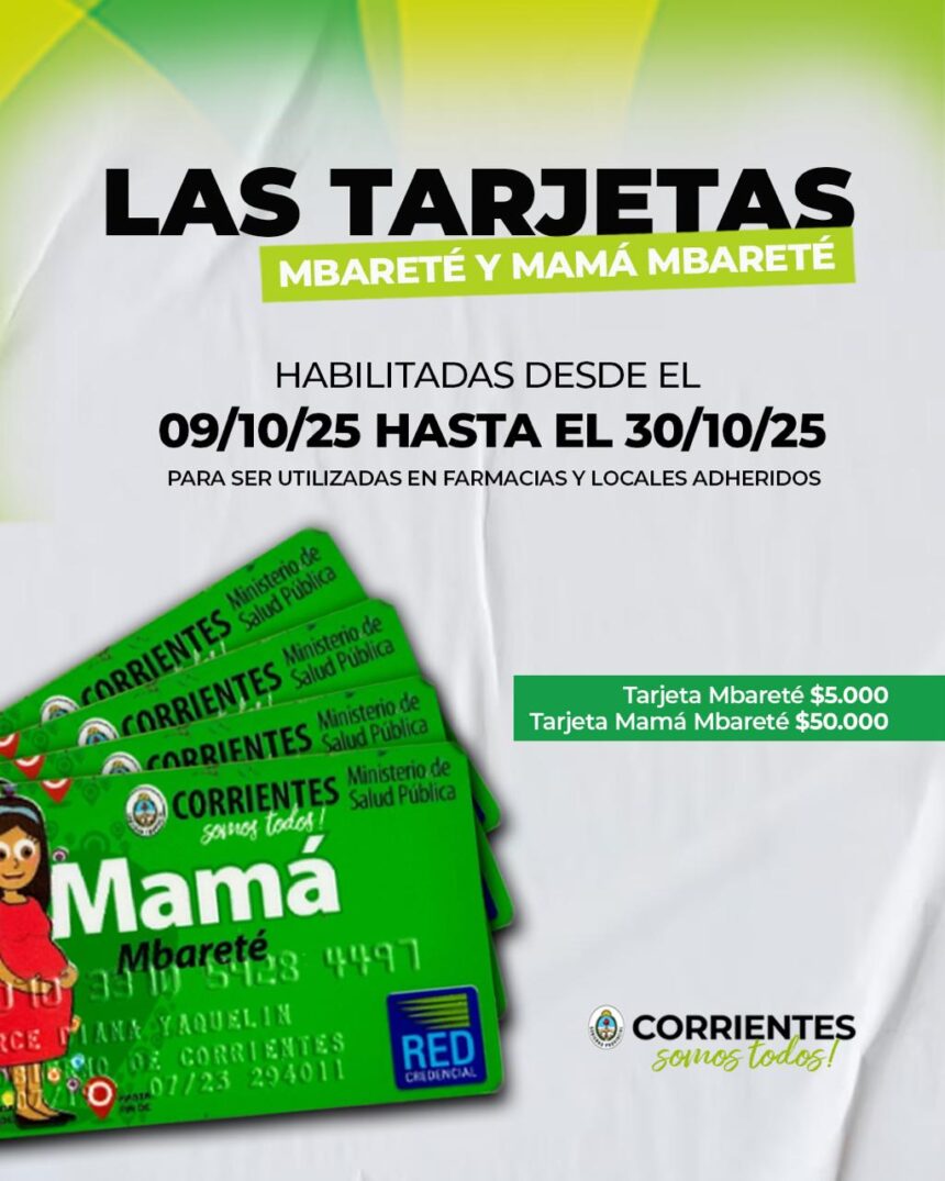 El Gobierno provincial, a través del Ministerio de Salud Pública a cargo de Ricardo Cardozo, comunica que las tarjetas Mbareté y Mamá Mbareté se encuentran habilitadas desde el 9 de octubre hasta el 30 de octubre de 2025 inclusive, para ser utilizadas por los beneficiarios de las mismas.
