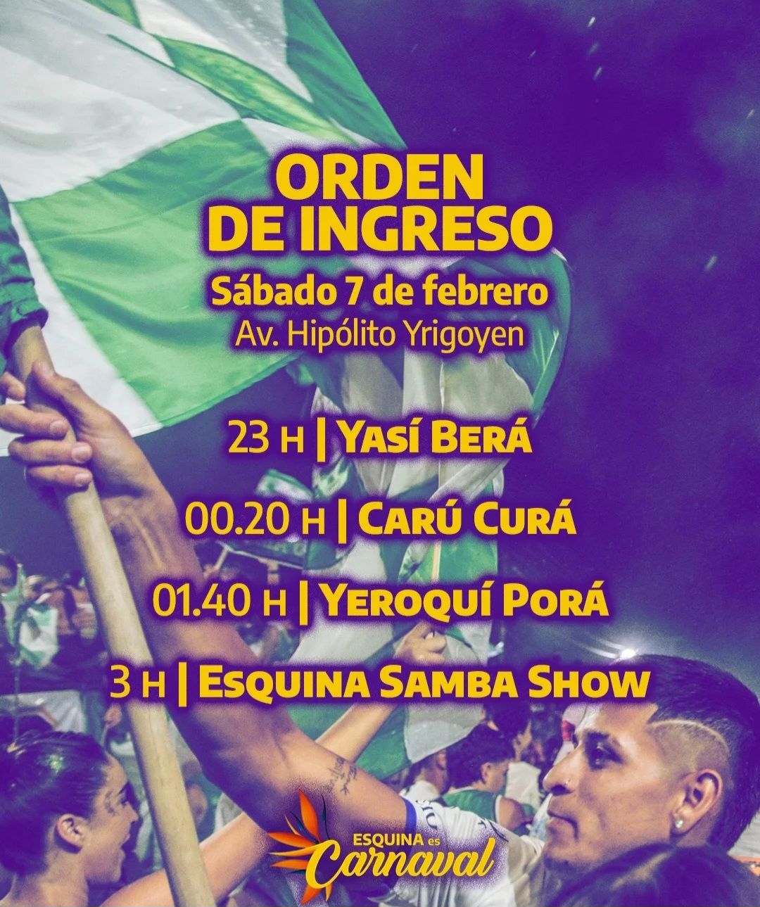 Una de las grandes protagonistas será Yeroquí Porá, que celebra sus 30 años de trayectoria y presenta en esta edición el tema “El Pinín”, una representación cargada de emoción sobre un emblemático navío muy recordado por los vecinos de Esquina. La propuesta revive parte de la historia local a través del desfile, el vestuario y las carrozas.