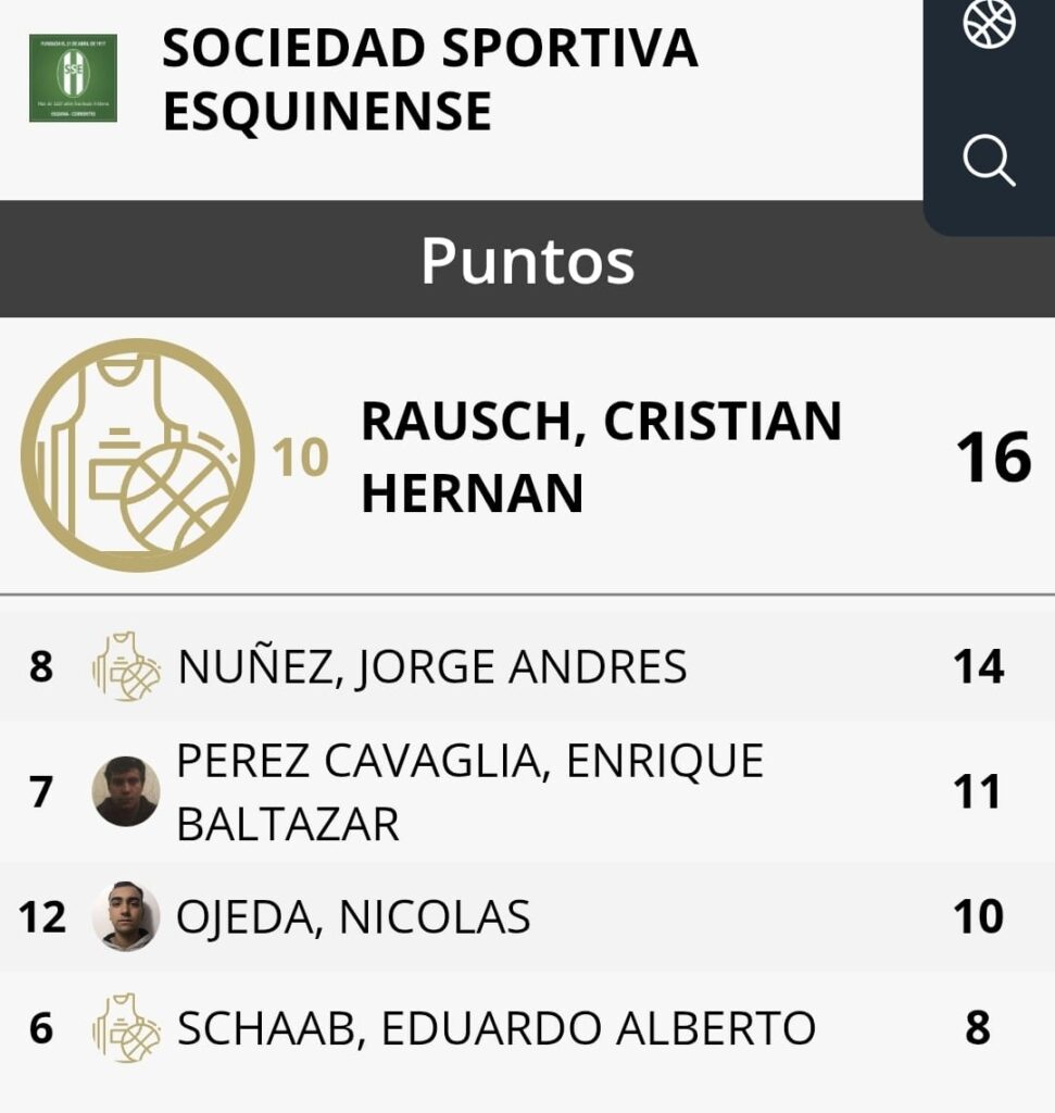 El máximo anotador del juego fue Cristian Rausch, con 16 puntos, acompañado por Jorge Núñez (14). También se destacaron Enrique Pérez Cavaglia (11), con gran aporte en defensa y rebotes, además de Nicolás Ojeda (10) y Eduardo Schaab (8), quien manejó el ritmo del equipo desde la base.