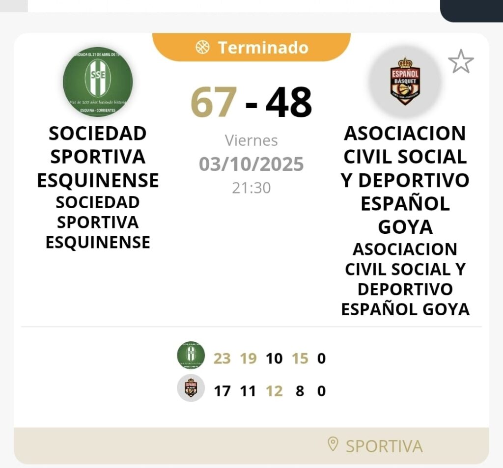 Este viernes, en el arranque de la segunda ronda del Torneo Pre-Federal de Básquetbol de la Provincia de Corrientes, Sociedad Sportiva Esquinense logró una victoria contundente sobre Asociación Española de Goya por 67 a 48, en un encuentro disputado el 3 de octubre en el estadio de Sportiva.