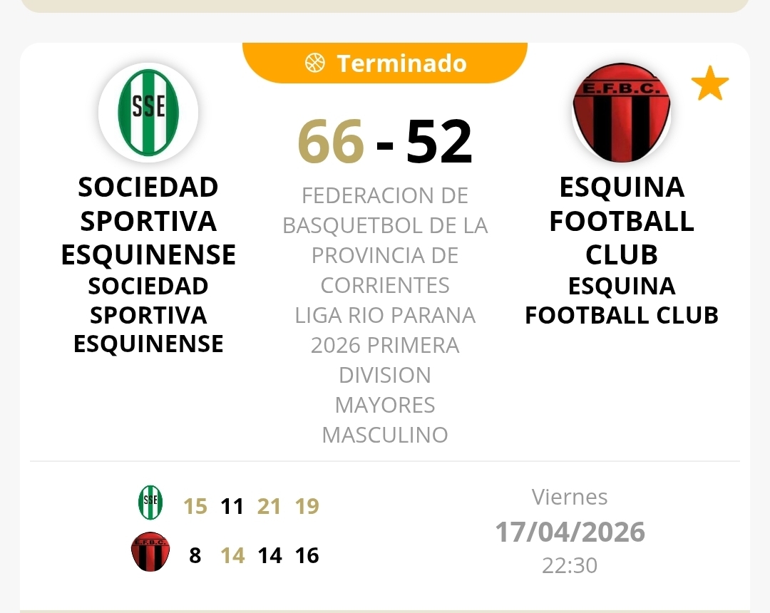 En el inicio de la temporada 2026 de la Liga Región Paraná de básquetbol de Primera División, Sociedad Sportiva Esquinense superó con autoridad a su clásico rival, Esquina Football Club, por 66 a 52, en un encuentro disputado el viernes por la primera fecha del Grupo B.