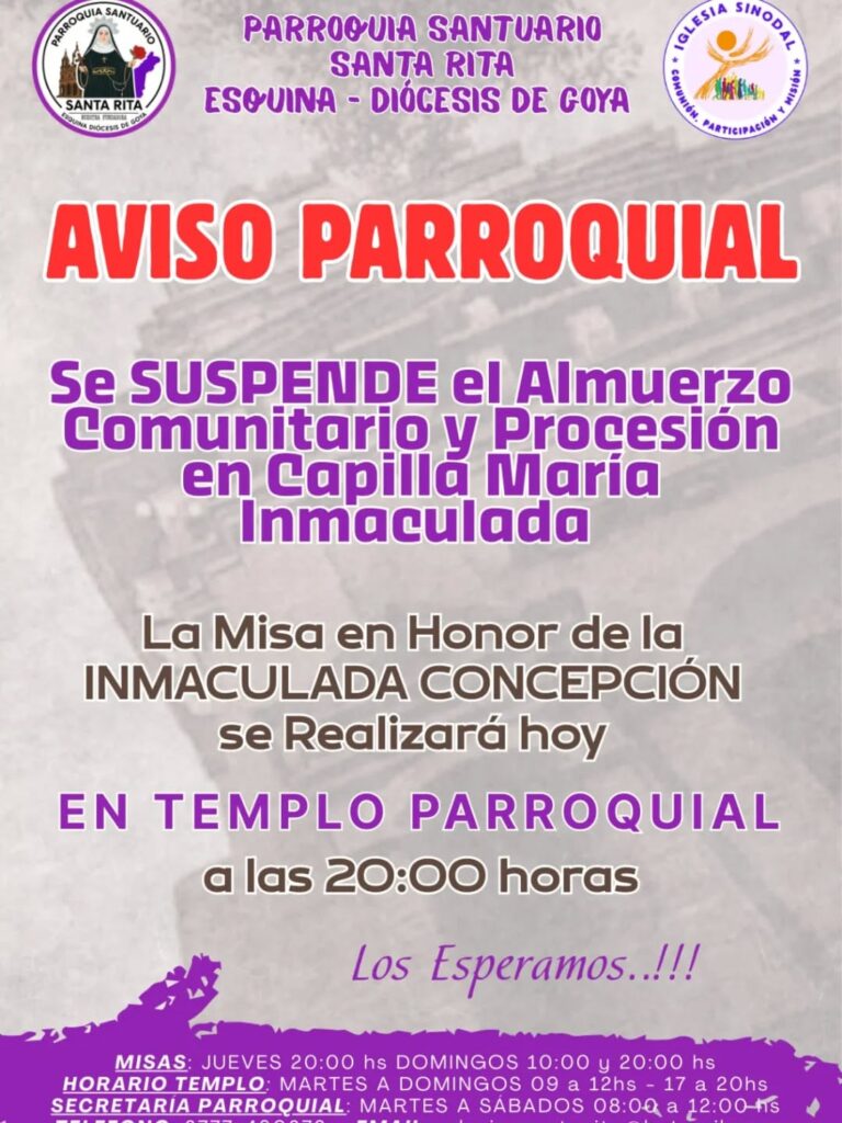 La Parroquia Santuario Santa Rita, de la Diócesis de Goya, informó que quedaron suspendidos el almuerzo comunitario y la procesión previstas en la Capilla María Inmaculada, debido a motivos no especificados en el comunicado oficial.