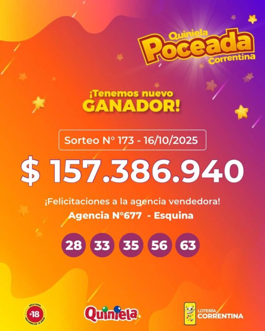 Un esquinense se convirtió en millonario tras ganar $157.386.940 en el sorteo de la Quiniela Poceada Correntina del jueves 16 de octubre. El afortunado acertó los cinco números de la jugada ganadora: 28, 33, 35, 56 y 63.