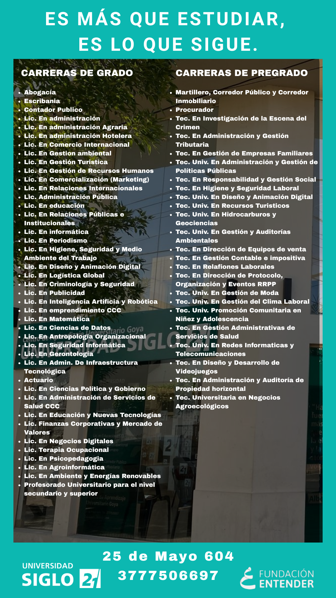 La sede Goya, ubicada en 25 de Mayo 604 esquina Belgrano, ya abrió las inscripciones para el ciclo 2026. Los interesados pueden comunicarse al 3777 506697 o por redes sociales como Universidad Siglo 21 Goya.