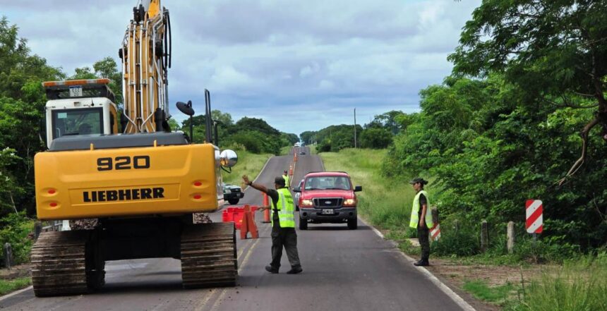 Personal de Vialidad Nacional lleva adelante trabajos de reparación sobre la Ruta Nacional N.º 12, a la altura del kilómetro 784, tras detectarse un socavamiento en la cinta asfáltica.